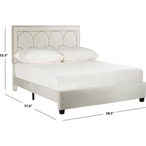 Luxurious and sumptuous, this contemporary bed creates an instant soothing oasis in any bedroom. Its plush cream velvet upholstery complements any decor style and it's antique brass finish adds character and charm. Designers love its smooth clean lines.