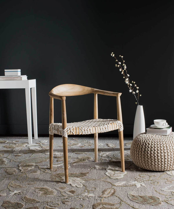 Clean lines meet artisan texture in this mid-century-inspired armchair. Sculpted from reclaimed teak with a light oak finish, its wraparound back and slender legs nod to Scandinavian classics. The seat is intricately laced in off-white leather webbing, adding a graphic pop and a surprisingly supportive ride. The wood's sun-washed grain softens the silhouette, while the open frame keeps rooms feeling airy around a dining table, desk, or entry. We love how the woven seat introduces movement without visual weight, and how the contoured back invites lingering. A modern staple with a handcrafted spirit.