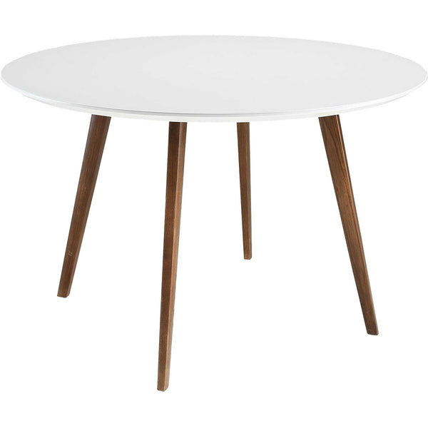 Clean-lined and quietly graphic, this round dining table nods to mid-century Scandinavian studios. We paired a crisp white, painted top with a slim beveled edge and tapered solid ash legs in a warm walnut tone - an easel-like stance that feels airy yet grounded. The round shape softens corners and makes conversation feel easy, while the smooth, wipe-clean surface stands up to weeknight dinners and weekend brunch. We love it as a modern anchor for open kitchens or small dining rooms, delivering contrast, warmth, and plenty of legroom beneath. Style it with simple chairs for an effortless, gallery-inspired look.