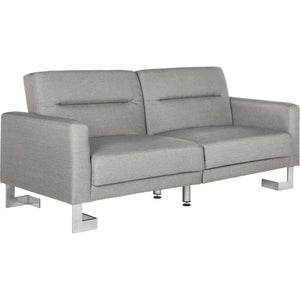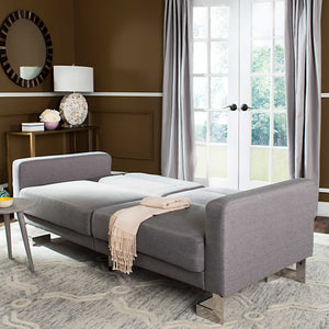 This compact loveseat nods to mid-century American design duos with its clean lines, split back, and tailored gray upholstery. Sleek polished steel legs and low, track arms keep the profile light, while subtle horizontal channeling adds just enough detail. By day, it seats two comfortably; by night, it folds flat into a streamlined sofa bed, with discreet center supports for added stability. The firm, supportive cushioning and smooth, woven fabric make it an easy fit for living rooms, offices, or guest spaces. We love how the crisp silhouette and cool gray tone play well with warm woods, modern art, and layered neutrals.