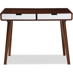 The spacious airy feel of the desk is attributed to four of its tall splayed legs which raise the body of the desk off the floor occupying minimal space both physically and visually. The dark walnut veneer finish provides a clean and sharp work surface, a defining contrast to the two drawers in white. Requires assembly.