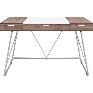 We looked to Scandinavian studio desks for this clean, dual-toned moment. A crisp white center panel anchors the warm birch wood-grain on either side, creating an inviting surface that stays easy to wipe clean. Three slim, full-width drawers keep notebooks, tech, and pens exactly where we need them, while the sleek metal sled base with triangulated cross-bracing feels airy yet sturdy. Low-profile pulls keep the lines tailored, and generous legroom makes long work sessions more comfortable. It is the kind of piece that lightens up an office or creative nook, mixing texture and modern polish without trying too hard.
