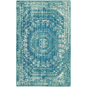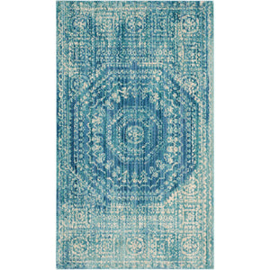 This transitional area rug seamlessly blends classic Persian design with contemporary colors and weaves. The Valencia Collection is a power loomed rug of soft synthetic yarns for exceptionally high performance and easy care. Vivid blue and soft beige designs are veiled by a distressed patina for a truly versatile floor covering.