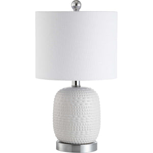 Inspired by contemporary sculpture, this artistic table lamp refreshes any living room or bedroom. Often used in pairs, its luxurious texture is highlighted by a bright white finish, paired with a chic silver base and a matching finial.