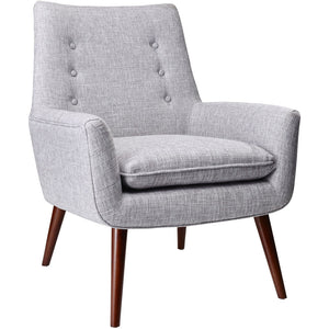 A contemporary spin on traditional design, the Adrian chair brings both style and comfort to the living room. Tapered legs and flared arms reveal a sleek, modern silhouette, while plush seating and a button tufted back embrace transitional technique. An intriguing contrast is presented by walnut wood legs and a soft, woven textured fabric. The light feathered gray will both brighten up and soften the style of surrounding decor.