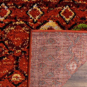 Tribal designs are beautifully displayed in this red area rug from the Amsterdam Collection. Vivid geometric motifs, made from soft synthetic yarns and highlighted in multi-color tones reach across the durable pile of this contemporary styled floor covering. Ideal for the family room, kids room, playroom or casual dining area.