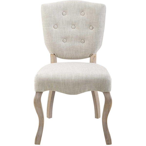Usher forth a harmonious dining environment with the Angie Vintage French Dining Side Chair. Four saber-shaped weathered wood legs develop a sculptured silhouette, while the shield back with button tufting displays hints of opulence. Complete with a generously padded seat, and soft polyester upholstery, Angie comes with non-marking foot caps to preserve floor integrity, supports up to 331 pounds, and does not require assembly.