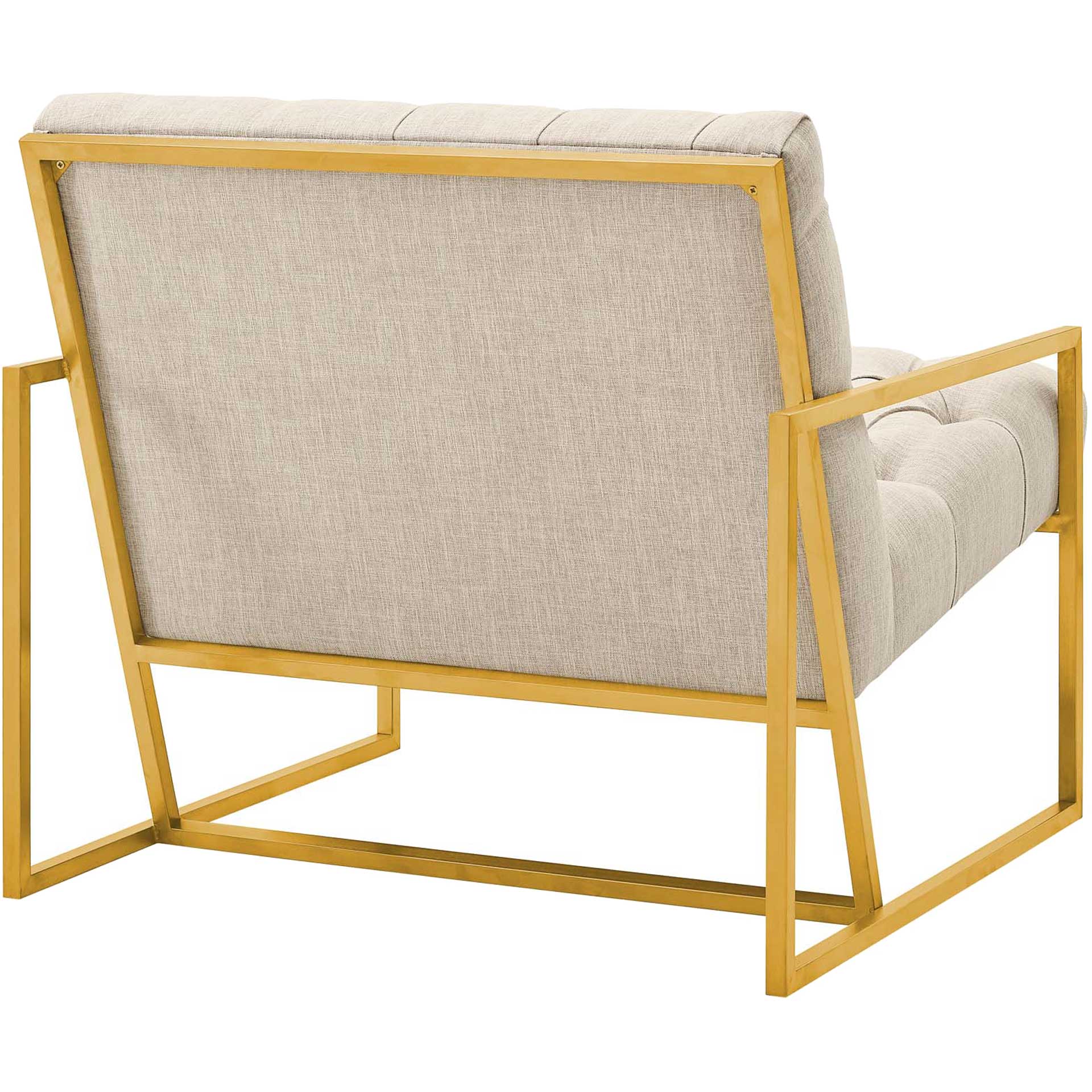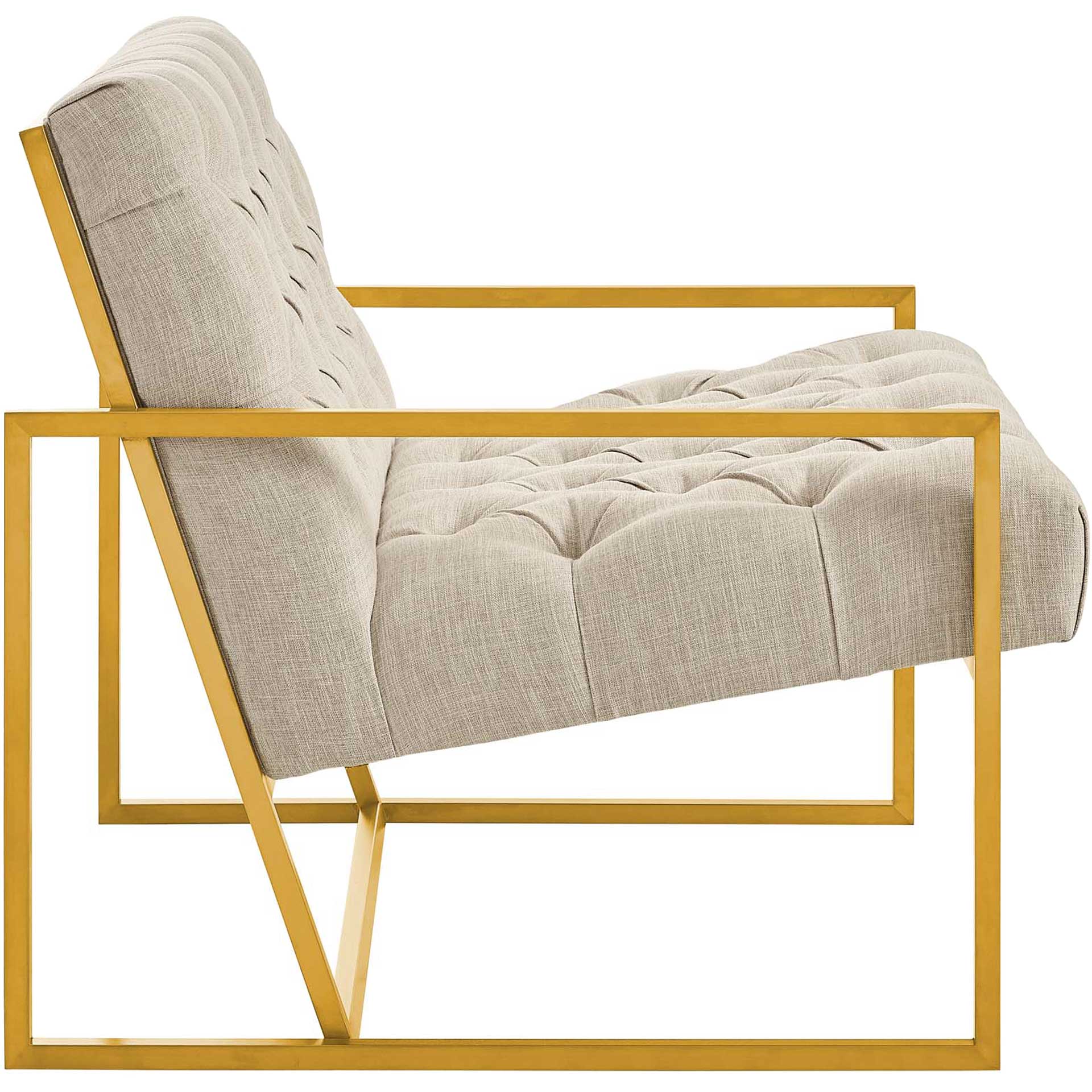 Welcome leisure time with the artfully designed Ballston Accent Lounge Chair. Boasting a striking gold stainless steel metal frame, upholstered in polyester fabric with deep button tufting with plush dense foam padding, Ballston elevates home and apartment decor with its glam aesthetic, sleek profile, cozy comfort, and ergonomic support.
