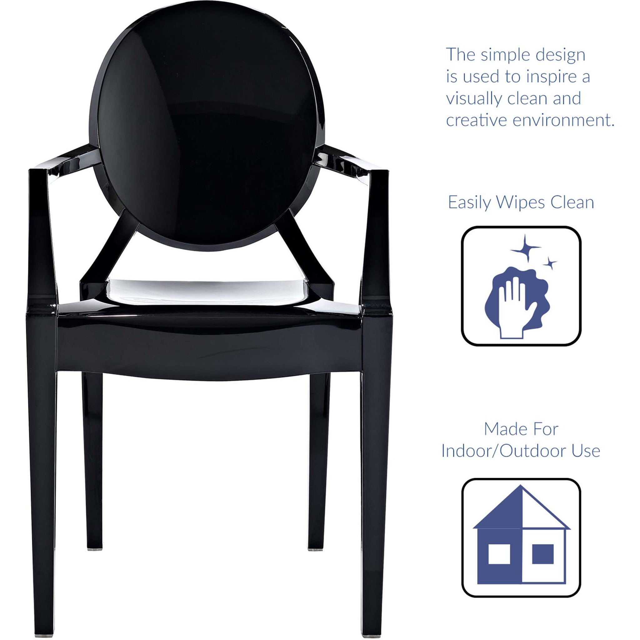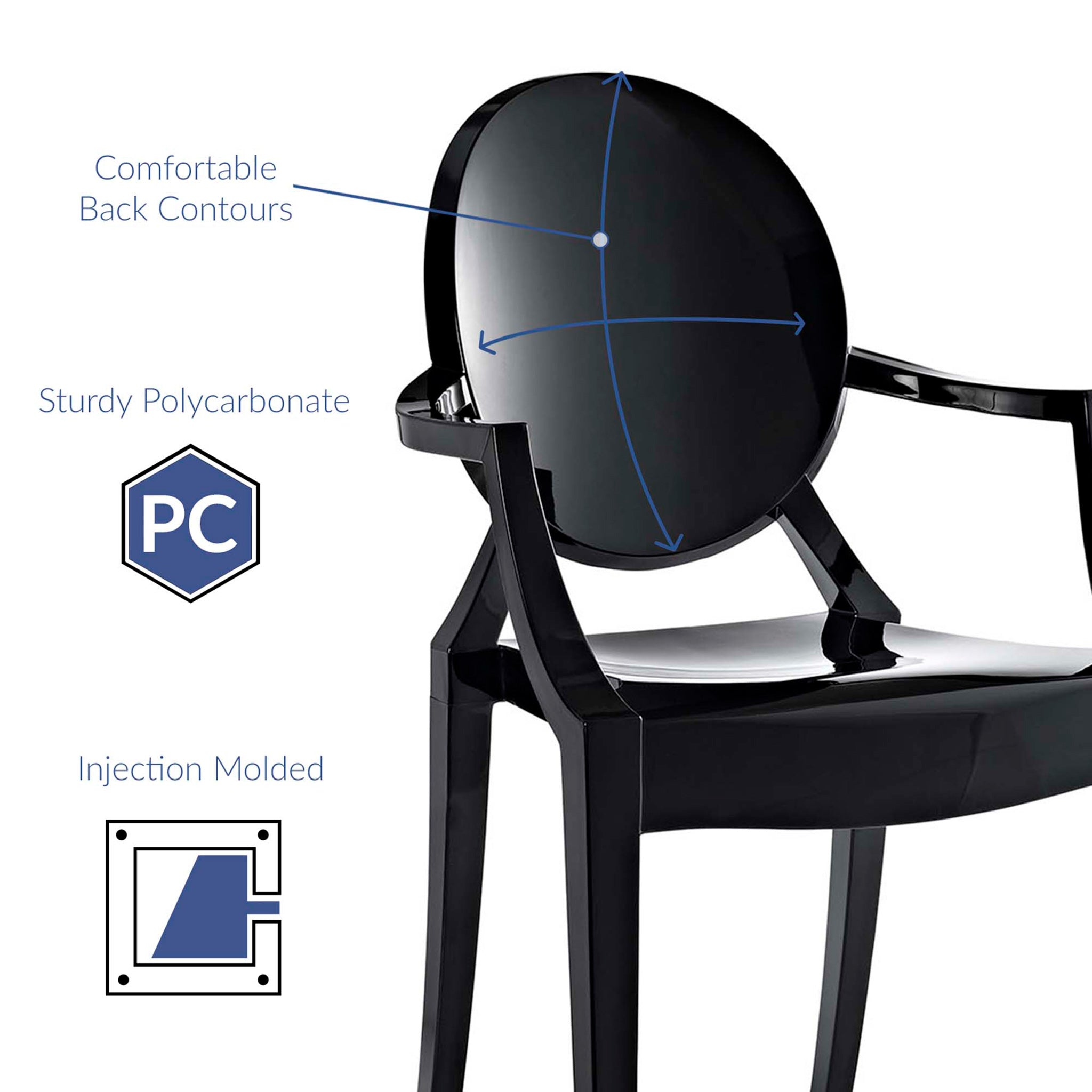 Grounded in the neoclassical Louis XVI medallion silhouette, this dining armchair takes a modern cue from Philippe Starck's playful reinventions. We love how the oval back, slim arms, and tapered legs are sculpted in a single, seamless form with a high-gloss black finish that reflects light beautifully. The molded construction brings surprising sturdiness while staying lightweight and easy to move. Equally at home around a dining table, at a desk, or pulled up to a vanity, it stacks when you need extra floor space and wipes clean after daily use, indoors or out.