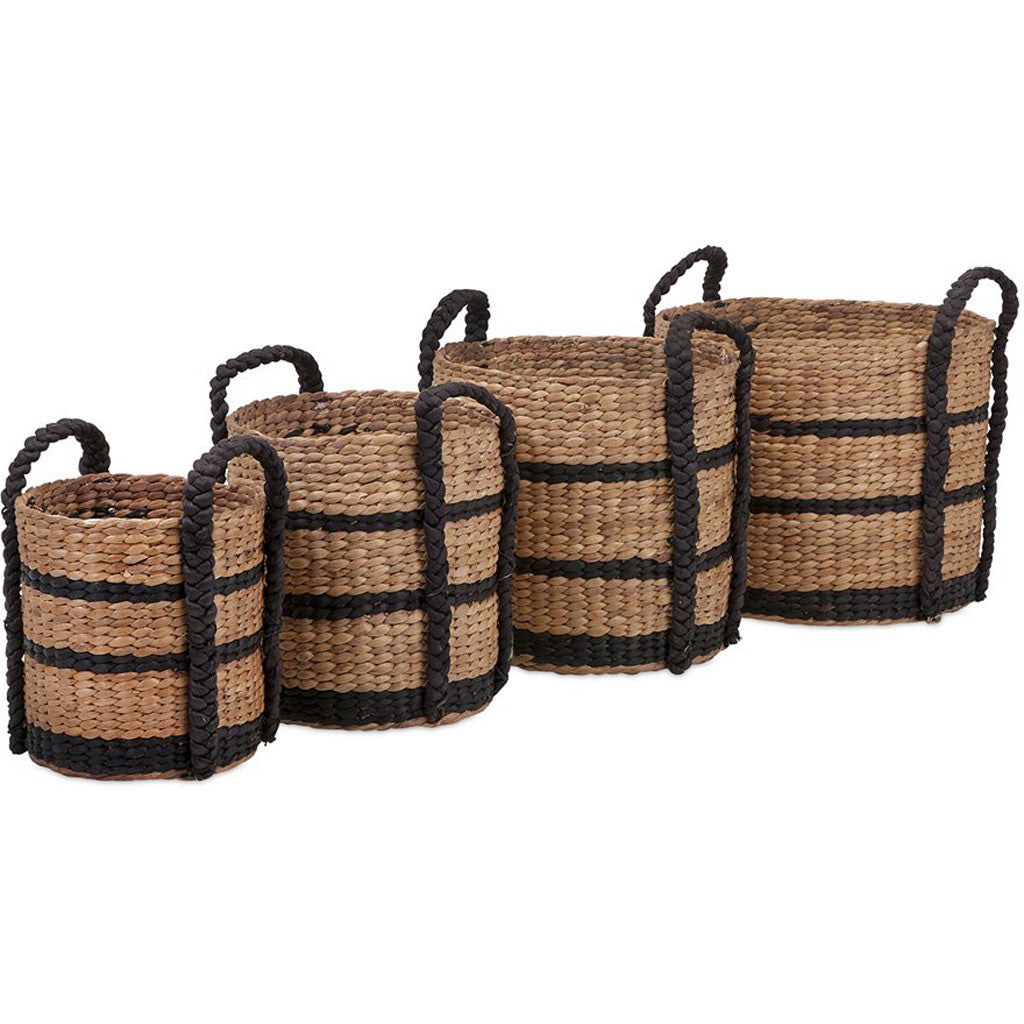 Twist and shout: A set of four black striped water hyacinth baskets with braided handles rocks.