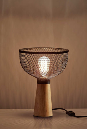 Add a dramatic industrial element to your dining or living space with the Dammarie Table Lamp. A contemporary black metal mesh shade is paired with a natural rubber wood cylinder base resulting in a modern industrial style with hints of scandinavian influence.This style looks great with all bulb types. Use a vintage edison bulb for soft, mood lighting or an LED bulb for efficient ambient light. At just 11.75" high, this light is the perfect accent piecethat can fit in small spaces. A simple on/off switch is located on a black fabric covered cord.