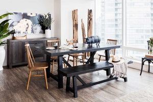 The Distill Dining Collection features a trestle style base, with a matte-black top. Finely crafted from FSC Certified reclaimed pine. Assembly required. Dust as needed or wipe with a clean dry cloth.