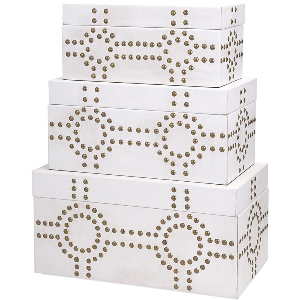 Designer Connie Post addresses the most challenging decorating issue of our day, lack of adequate storage, with a set of glamorous, leather-look trunks bejeweled with gold studs arranged in a modern, graphic pattern. Set of three.