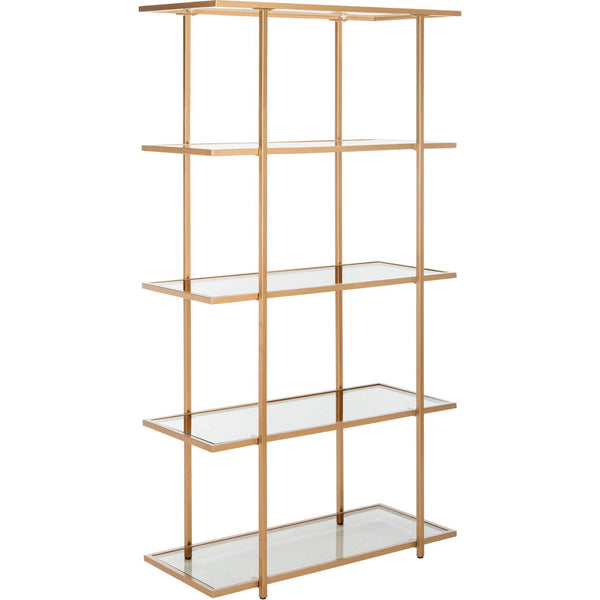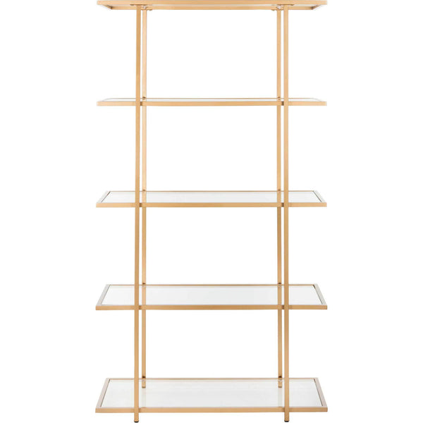 Add a touch of Hollywood regency to your decor with this modern metal 5- tier etagere. A sophisticated pattern and luxurious gold finish frame each of its five chic glass shelves. Its clean lines and timeless glamour refresh any living room.