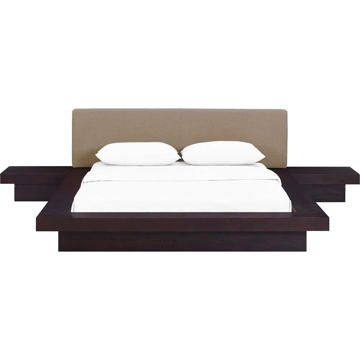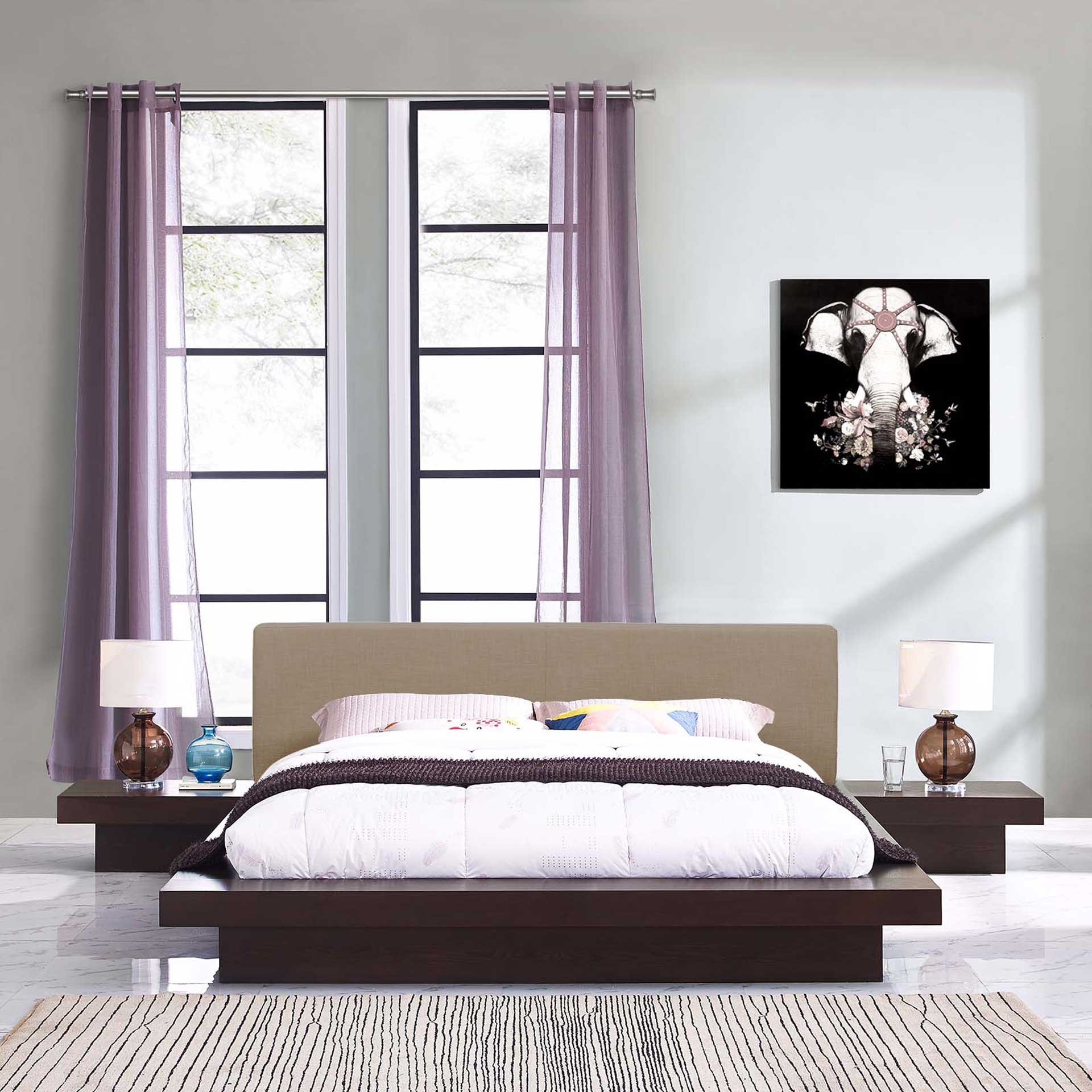 Instantly transform your bedroom landscape with the Freyja Bedroom Set. Designed with clean straight lines and a compelling aesthetic, Freyja features a sturdy laminated particleboard base with cappuccino veneer, foam-padded headboard upholstered in polyester fabric, slatted support that eliminates the need for a box spring, and a reinforced center beam with supporting legs for maximal stability. Update your bedroom decor with an engaging platform bed which evinces a refined look and striking design. Freyja admirably supports mattress types such as memory foam, spring, latex, and hybrid. Mattress Not Included.