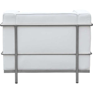 Grandeur Chair is covered in genuine leather on front, sides, back and cushions. Chair has a polished stainless steel frame.