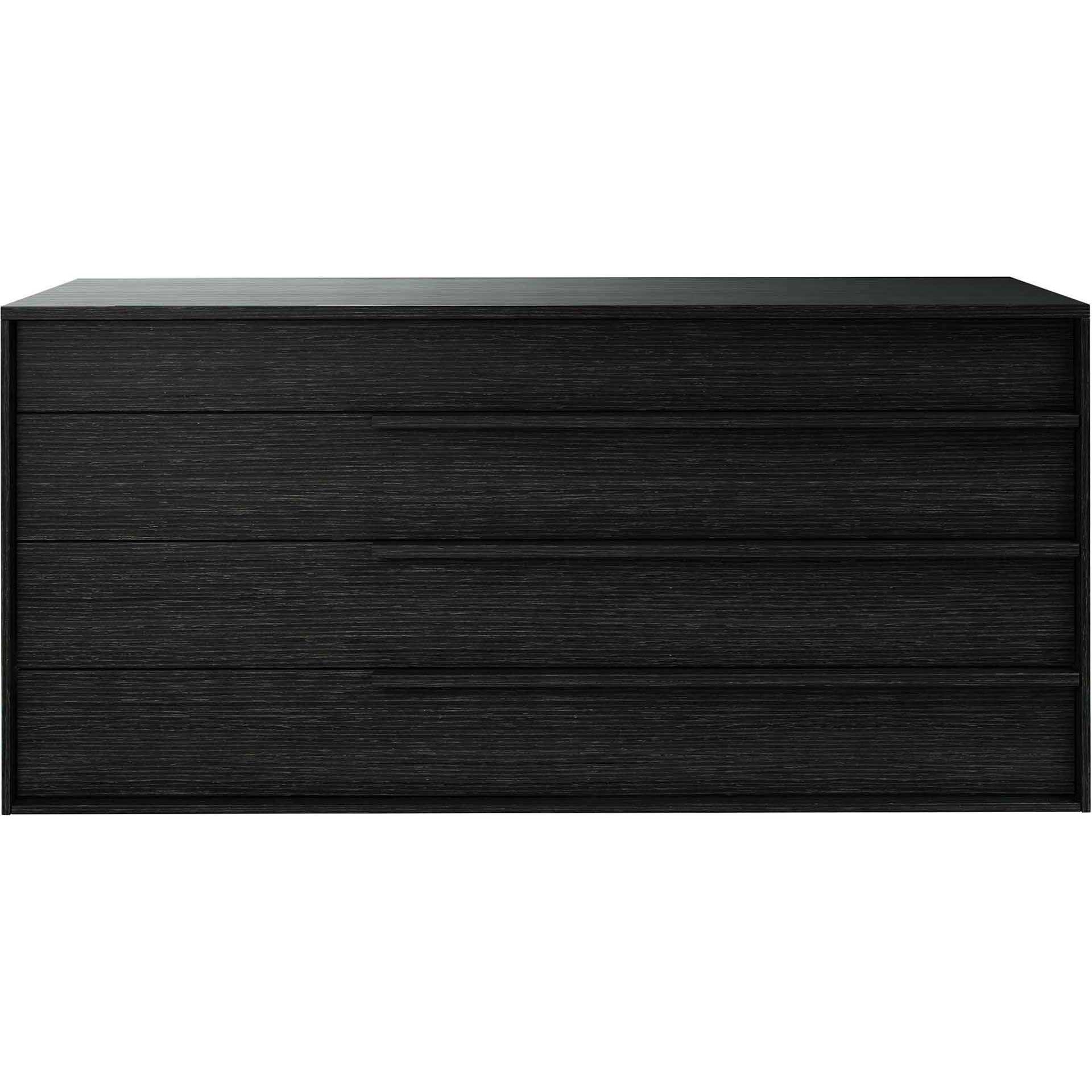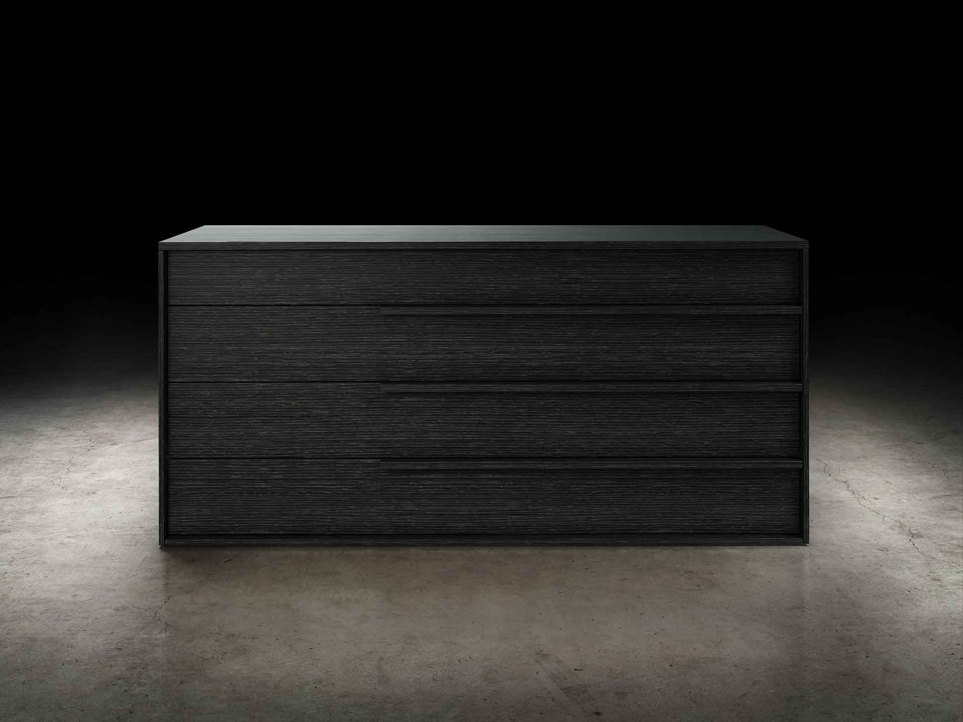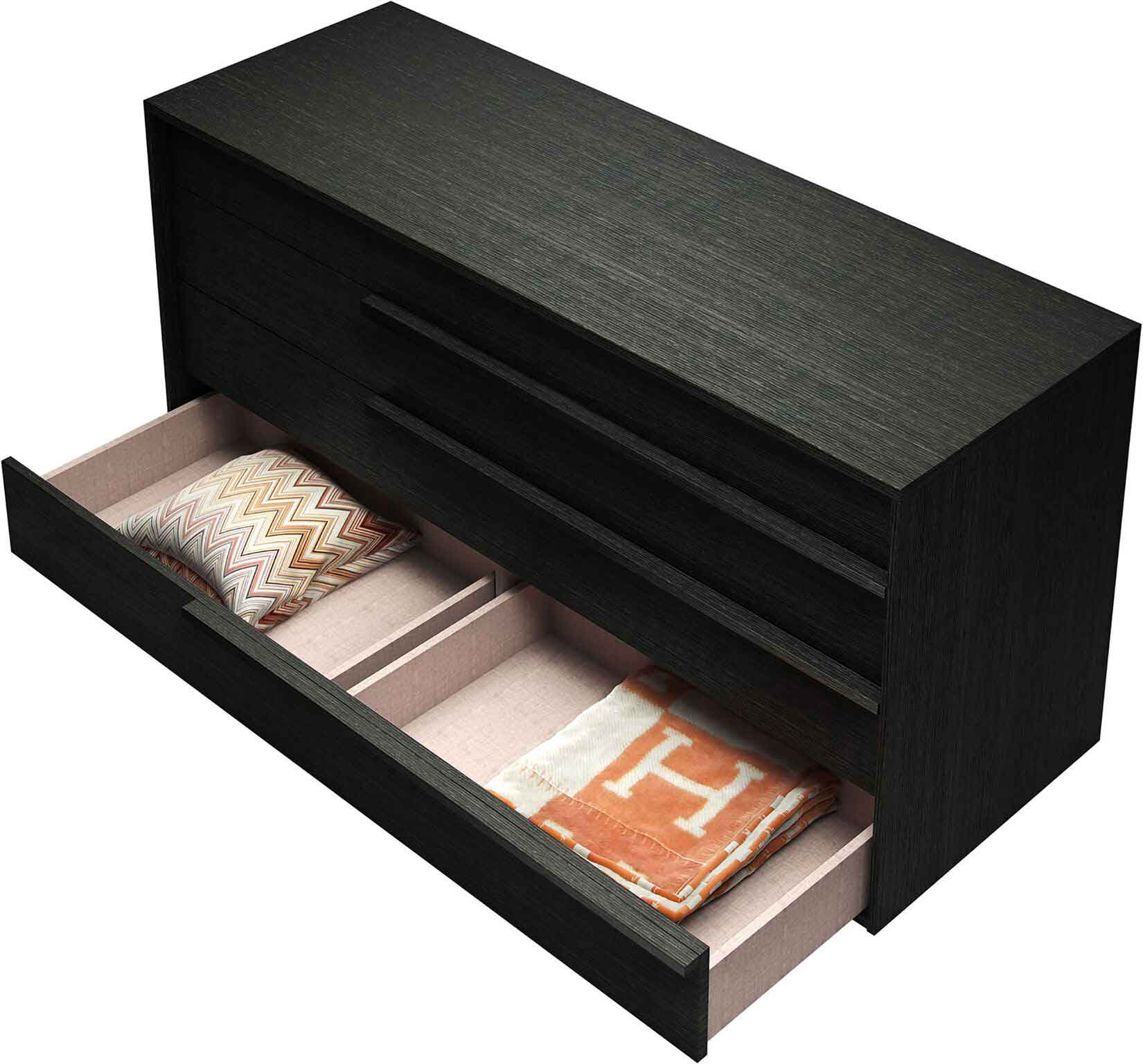 The generously proportioned Jane four-drawer dresser with sleek handgrips matches any modern bedroom decor. Features three full-size wardrobe drawers and one top accessory drawer. Italian Danco-brand soft-closing hardware enables smooth and effortless drawer movement. Interior of drawers elegantly lined in light beige linenboard.