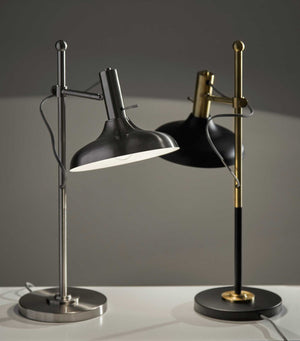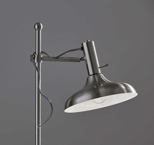 Make a statement with the Keith Desk Lamp. A brushed steel finish adds elegance to this industrial silhouette. Adjust the jumbo sized shade up and down to suit your lighting needs. A black and white fabric covered cord trails out from the shade and around the pole for a unique, decorative look. A simple on/off rotary switch is located conveniently on the socket.
