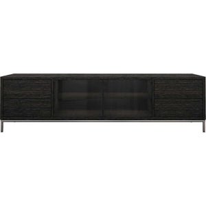 The Lenox media cabinet delivers a sleek edge to media storage; featuring slate tinted IR-friendly glass doors for easy access to all your A/V components. Four flush standard push-open drawers create a smooth facade. Behind the glass doors, a center cabinet splits into four equal sized compartments. Contains rear ventilation holes for wire management, perfect for all LCD TVs. Polished steel tube frame with four legs give the Lenox some added height while maintaining its low-profile presence.