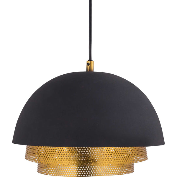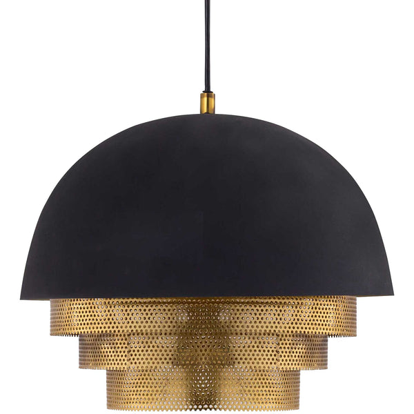 Add a warm glow and stylish atmosphere with the Lucretius pendant. Flaunting a matte black dome over three tiers of perforated brass rings, it's available in two sizes. Use alone are in groups to brighten up your space.