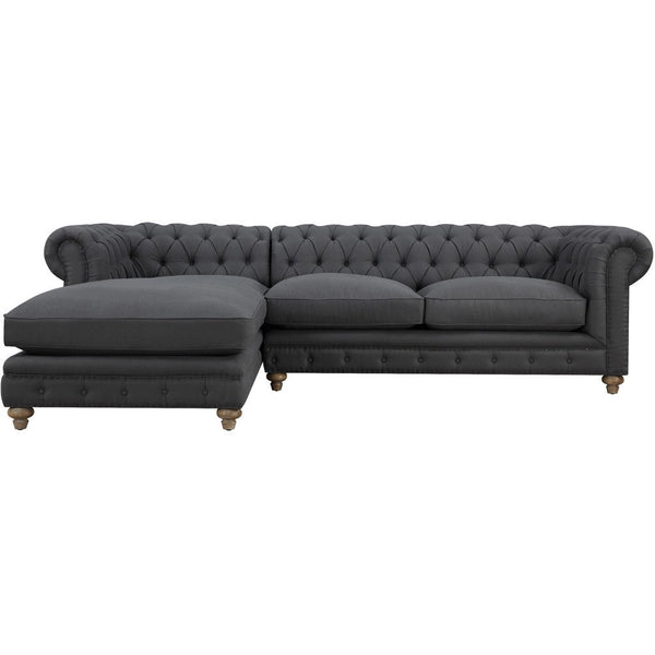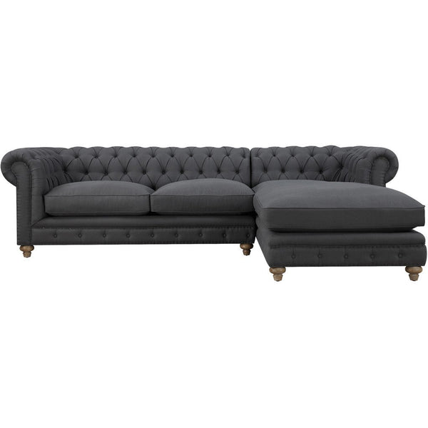 Our version of the classic Chesterfield style, the Oxby tufted sectional sofa, offers an elegant yet slightly industrial look. Featuring a solid wood kiln dried frame, Gray linen fabric, hand-hammered shoe nailheads, feather down cushions and eight-way hand-tied spring suspension that will stand the test of time. The smooth lines of this classic piece are accented by gorgeous hand-applied button tufting on the rear cushions, arms and front, while the weathered Oak legs complete the sophisticated look.