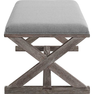 Introduce the simple elegance and rustic charm of vintage French-inspired style with the Park Bench. Adding functional seating to your entryway foyer, bedroom, or living room, this modern farmhouse accent bench features subtle piped trim, clean lines, and a weathered wood frame with X-brace details and horizontal stretcher. Finely upholstered in beautiful polyester fabric with dense foam padding, this upholstered bench is a perfect addition to modern farmhouse, contemporary, and vintage themed decors. Includes plastic foot caps to protect flooring.