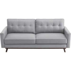 Experience modern-day convenience with Pearl. A stylish addition to your living room, office, or small living space, Pearl is a cozy mid-century modern sofa made with dense foam padding, upholstered in soft polyester fabric, and positioned on a walnut stained wood frame with splayed legs and non-marking foot caps. With a comfortable yet tailored profile, this living room sofa ships directly to your home or apartment in a compact box, and easily unpacks to become a favorite lounge spot in your home. Pearl beckons guests to sit and stay a while with linear button tufting and subtle welting that grants this modern sofa an approachable appeal.