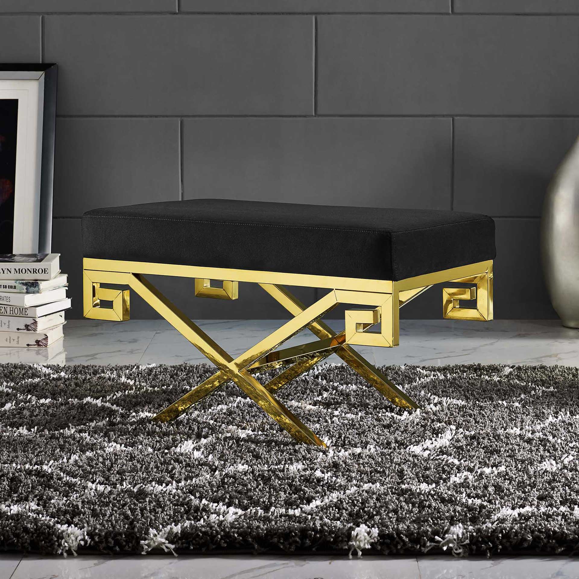 Embrace modern whimsy with Rayna. Brimming with energy and a sleek modern look, Rayna features a polished gold stainless steel base with a Greek Key design, dense foam padding, and a soft stain-resistant velvet polyester upholstered top. A striking statement piece in the living room, bedroom or lounge area, Rayna can support up to 331 pounds and comes with foot pads to help protect your flooring.