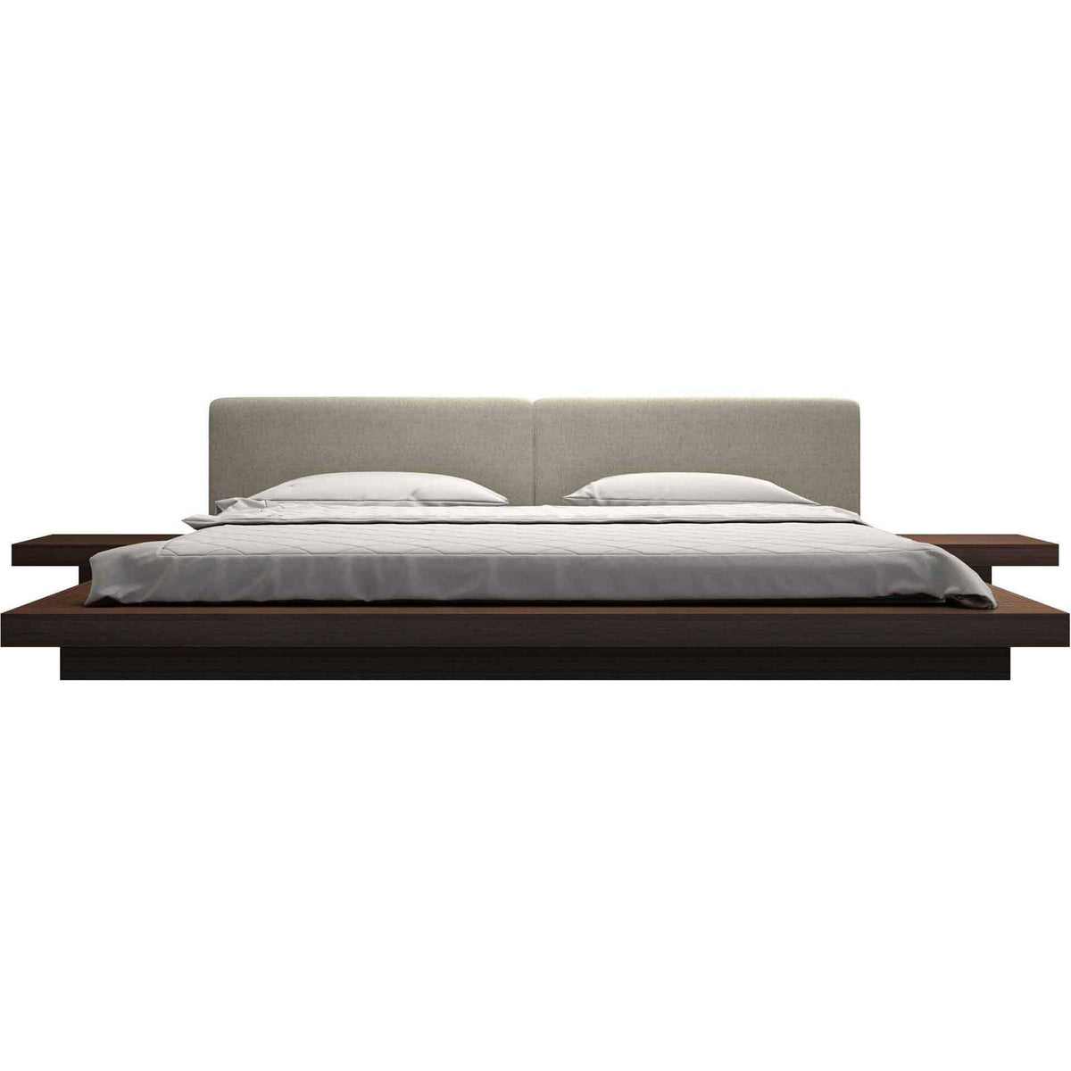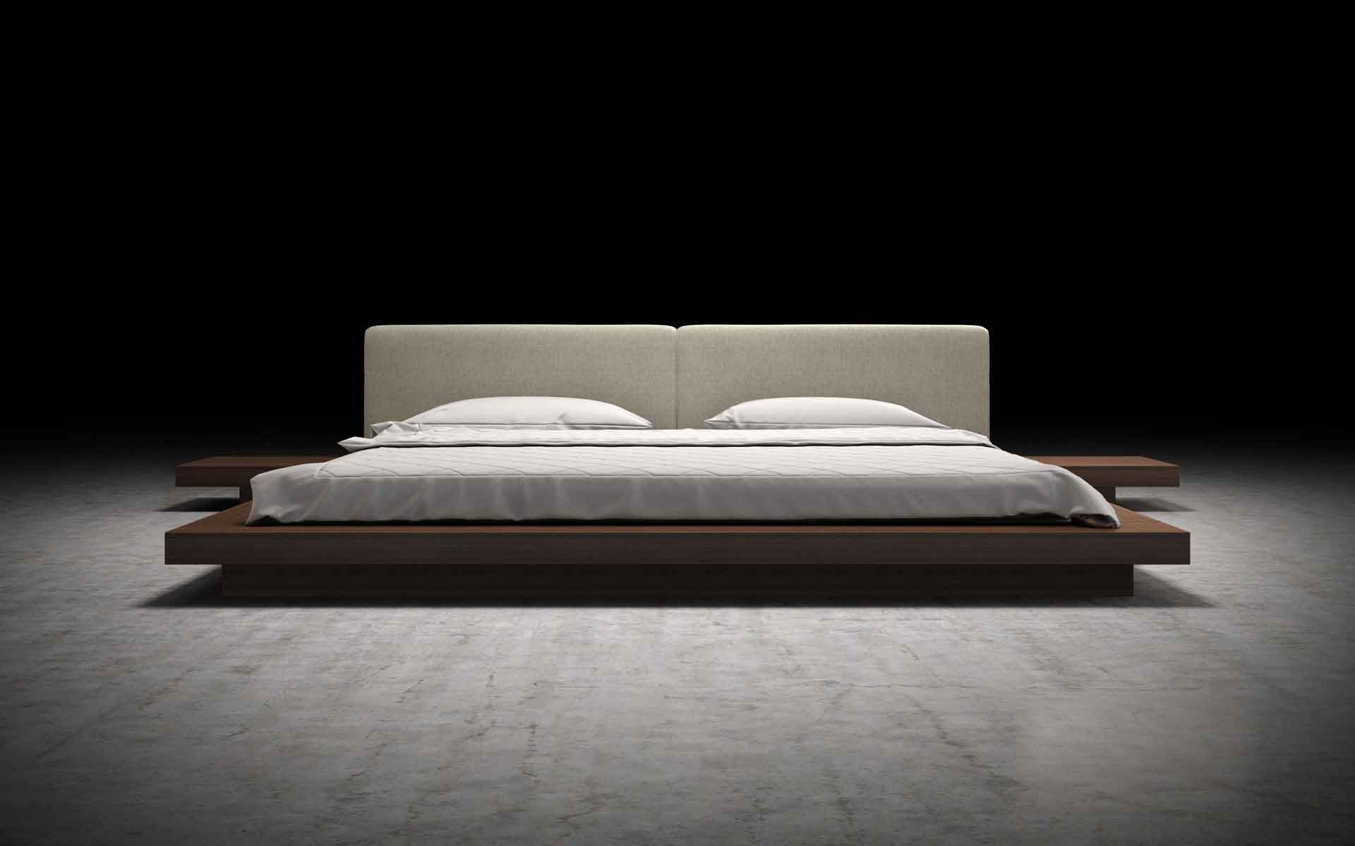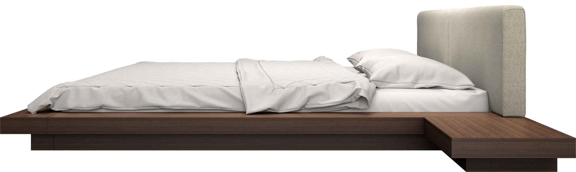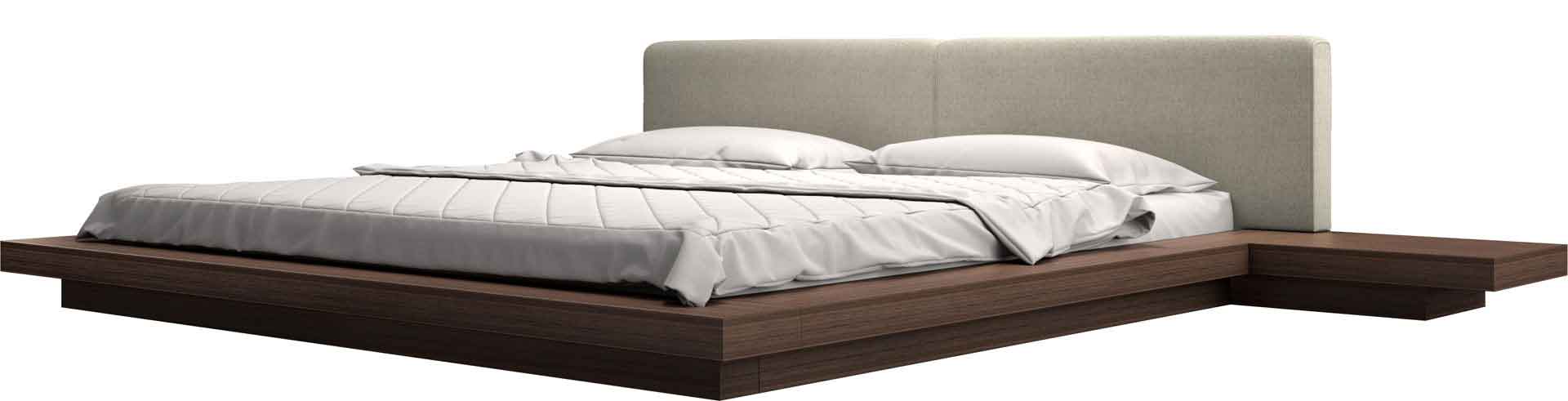 The Japanese-inspired Worth platform bed features a low profile hardwood frame with matching symmetrical nightstands finished in natural veneers. An upholstered eco pelle headboard compliments this lavish feng shui bed. Inner-spring or Foam/Latex mattress sits snuggly atop a flat, solid pine platform with air ventilation providing a cleaner, healthier sleep. Includes two matching nightstands each measuring 24W x 18D x 7H. Platform height measures 7 inches (2 inch inset). No box spring necessary. Mattress not included.